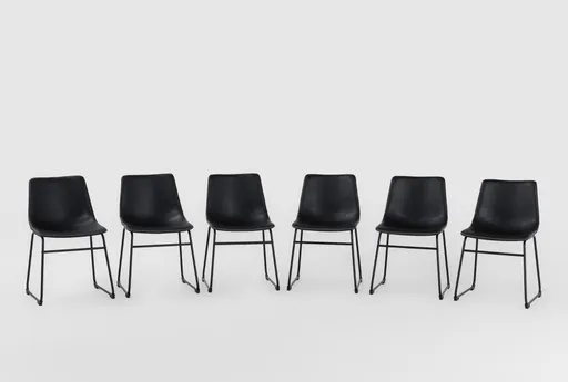 The Cobbler Black Faux Leather Bucket Seat With Baseball Stitch Dining Side Chair Set Of 6 is perfect for your dining room. Featuring a modern design, these chairs are made with faux leather upholstery and metal legs, providing both comfort and durability. The bucket seat design with baseball stitch adds a unique touch to your dining space.