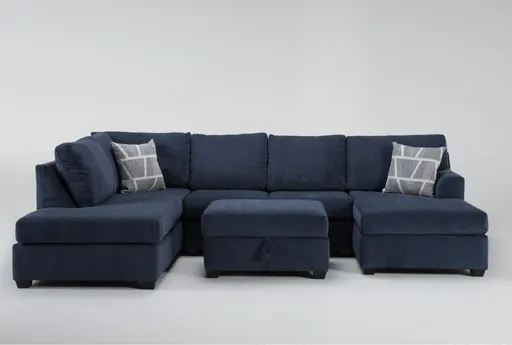 Introducing the Colby Navy Blue Fabric 128" 3 Piece U-Shaped Sectional with Right Arm Facing Chaise & Left Arm Facing Corner Chaise & Storage Ottoman. This versatile sectional is designed for comfort and functionality, making it a perfect addition to any living room. Upholstered in durable 100% polyester fabric, its deep navy color adds a touch of sophistication to your space.