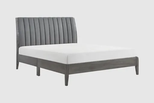 Introducing the Cole Grey Queen Platform Bed with Velvet Channel Tufted Headboard, a perfect blend of modern and mid-century modern styles. This elegant bed features a wire brushed gray finish and is upholstered in luxurious 100% polyester velvet fabric. The engineered wood frame ensures durability, while the included headboard, footboard, slats, and rails provide a complete and sturdy setup. No foundation or box spring is required, making it a convenient and stylish addition to your bedroom.