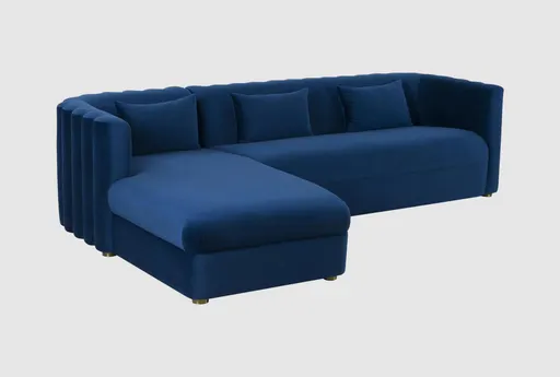 Introducing the Colette Navy Blue Velvet Fabric Two Piece 112" Curved Sectional with Left Arm Facing Chaise. This modern sectional is designed to bring comfort and style to your living room. The deep-seated design and plush velvet fabric make it a perfect spot for relaxation.