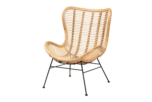 Colorado Modern Bohemian Natural Brown Rattan and Black Metal Accent Chair brings a relaxed modern bohemian silhouette to the living room with an enveloping woven rattan shell and a plush, contoured seat. Natural brown rattan pairs with a slender black metal base to keep the piece visually light while providing reliable support. Tuck it into a reading nook or beside a sofa to add texture and comfortable seating to your space.