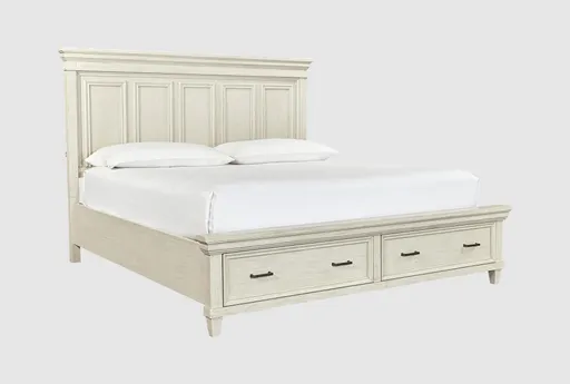 Introducing the Coltyn White King Wood Storage Bed, a perfect blend of traditional and classic styles. Crafted from select hardwood with oak and birch veneers, this bed features an elegant aged ivory finish that adds a touch of timeless charm to any bedroom. The Eastern King size ensures ample space for a comfortable night's sleep, while the integrated storage drawers and USB headboard charging ports offer modern convenience.