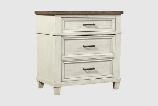 The Coltyn White 2-Drawer Nightstand with Power Outlets combines traditional style with modern functionality. Crafted from select hardwood with Oak and Birch veneers, this nightstand features an aged ivory finish that adds a touch of classic elegance to any bedroom. The nightstand is equipped with canted AC outlets, cedar-lined bottom drawers, and felt-lined top drawers, ensuring both convenience and luxury.