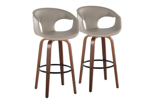 Conne 30" Barstool With Swivel In Walnut Wood And Light Grey Faux Leather brings contemporary comfort to the kitchen or dining room with a curved barrel seat and a practical profile. Upholstered in light grey faux leather with a cushioned seat and a cutout back, each stool sits on tapered walnut wood legs and a round black metal footrest for steady support. The swivel seat and recessed armrest make it easy to move and settle in, so this set of two fits islands, counters, and casual dining spaces with everyday versatility.