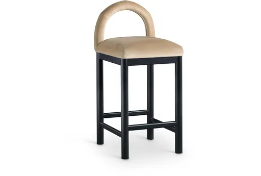 The Conny Beige Velvet 27-inch Counter Height Stool With Black Legs brings modern poise to the dining room with a plush, curved back and a comfortable footrest. Upholstered in beige velvet over a foam cushion, the seat rests on plywood support and ash wood legs finished in black for a refined, durable result. Reinforced joinery and an armless silhouette make this 27-inch counter stool easy to tuck under islands and counters while providing supportive seating for meals and casual work. Its clean modern lines fit a range of kitchen and dining layouts without overwhelming the space.