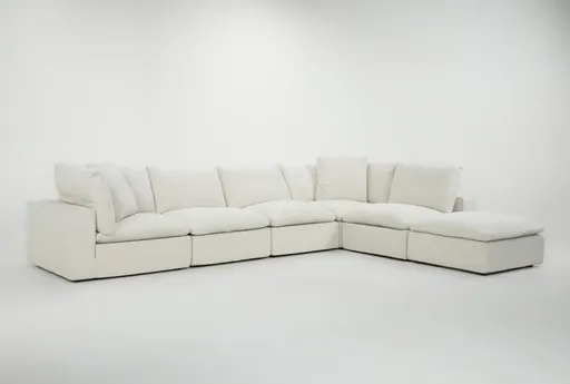 Contour Cloud Canvas Cream 160" 6 Piece Modular Sectional pairs modern modular design with roomy, casual comfort to anchor your living room. Upholstered in a high performance fabric blend (67.47% olefin, 32.53% polyester), the Canvas Cream cover feels soft while standing up to everyday life. The six-piece layout reconfigures into left- or right-facing and open arrangements, and the sectional is made in the USA for reliable quality.