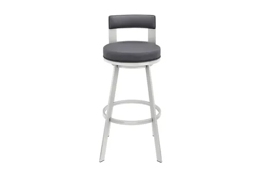 The Copia 26" Swivel Counter Height Stool in silver metal with grey faux leather is a stylish addition to any dining room or kitchen. Designed for modern living, this armless stool combines comfort with functionality. The swivel feature allows for easy movement and flexibility, making it perfect for social gatherings and food prep.