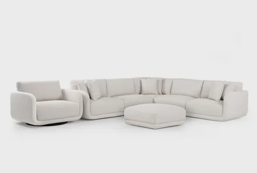 Corba Ecru 5 Piece Modular Sectional Oversized Swivel Chair & Ottoman with Casters Set delivers flexible, comfortable seating for living rooms that need adaptable layouts. The modular components let you reconfigure seating for movie nights, gatherings, or solo lounging, while the oversized swivel chair turns for easy conversation. Upholstered in ecru 100% polyester fabric over a pine frame, it features medium firm cushions for supportive comfort and an ottoman on casters for effortless repositioning.