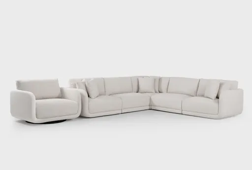 Corba Ecru 5 Piece Modular Sectional & Oversized Swivel Chair Set brings flexible, comfortable seating to the living room with a five-piece modular layout and an oversized swivel chair that rotates to suit your space. The ecru fabric upholstery is 100% polyester and covers medium firm cushions designed to offer balanced support for everyday use. A pine frame provides reliable support and the reversible configuration lets you rearrange the sectional to fit different room layouts.