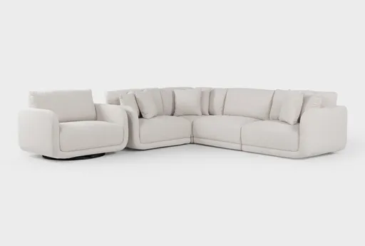 The Corba Ecru 4 Piece Modular Sectional & Oversized Swivel Chair Set pairs a roomy modular sectional with an oversized swivel chair to create flexible seating for your living room. Upholstered in ecru 100% polyester fabric and supported by a pine frame, it offers medium-firm cushions that balance everyday comfort and support. The four-piece, reversible configuration makes it easy to rearrange the layout to suit different rooms and gatherings.