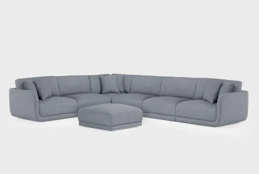 Corba Slate Blue 6 Piece Modular Sectional & Ottoman with Casters Set brings flexible, living-room-ready seating with a modular layout you can rearrange to suit your space. Upholstered in 100% polyester fabric, the six-piece set pairs medium-firm seating with plush back cushions for supportive everyday comfort. A pine frame provides reliable support, and the included ottoman on casters makes moving and reconfiguring the set quick and easy.