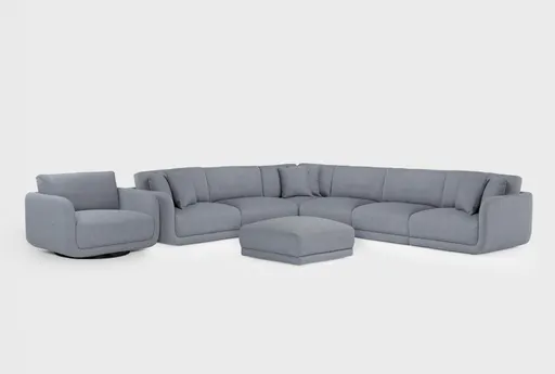 Corba Slate Blue 6 Piece Modular Sectional Oversized Swivel Chair & Ottoman with Casters Set brings flexible seating to the living room with a six-piece modular layout and an oversized swivel chair. Upholstered in 100% polyester fabric on a pine frame, it pairs medium firm cushions with deep seating for supportive, relaxed lounging. The swivel chair and ottoman sit on casters so you can rearrange the layout or move the ottoman without lifting, making this set a practical choice for high-traffic living rooms.