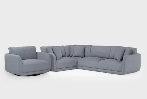 Corba Slate Blue 4 Piece Modular Sectional & Oversized Swivel Chair Set brings flexible seating to your living room with a four-piece modular sectional paired with an oversized swivel chair that adapts to how you use the space. Upholstered in 100% polyester fabric with medium-firm seat cushions and a pine frame, it balances support and everyday comfort while staying easy to live with. Reversible sectional components and the chair's smooth swivel make rearranging simple so the group can gather, relax, or entertain however you like.
