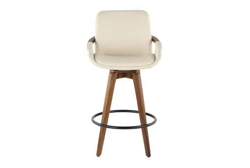 Introducing the Cosmic Cream Faux Leather Metal Swivel Counter Height Stool, designed to bring a modern touch to your dining room or kitchen. This armless stool features a sleek cream faux leather seat paired with a sturdy black metal base and walnut bamboo legs. The curved design and tapered legs add a stylish flair, making it a perfect addition to any contemporary space.
