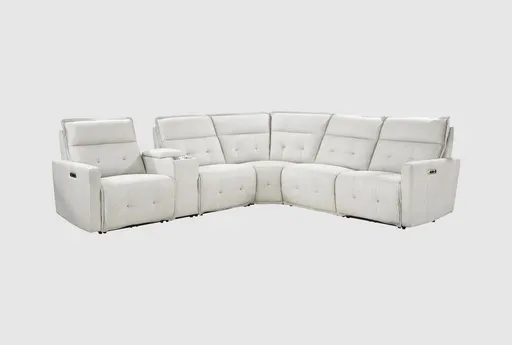 Experience the ultimate in comfort and style with the Crackle White 6 Piece Power Reclining Modular Sectional. This modern, white fabric sectional is designed for versatility and convenience, featuring power headrests, wireless charging, and ample storage. Perfect for any living room, family room, or great room, this sectional offers a sleek and sophisticated look with its clean lines and tufted embellishments.