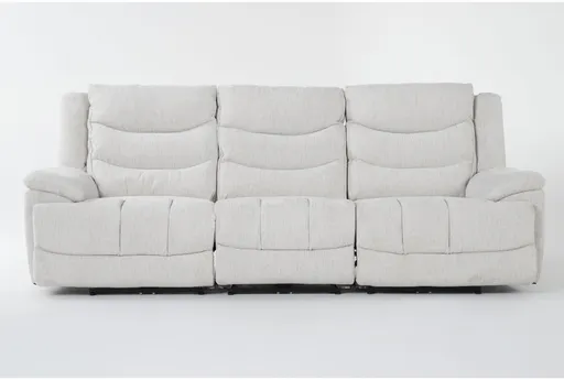 The Cruz Ecru 101 inch three-piece power reclining modular sofa blends casual styling with features built for modern living room furniture. Upholstered in textured fabric in a neutral beige and ivory palette, it offers deep-seated divided loose back cushions and a defined track arm silhouette that reads clean and contemporary. Integrated USB ports and foam-filled seats make it ideal for movie nights and long lounging sessions, while the modular three-piece layout gives flexible configuration options for varying floor plans. Oversized seating and a horizontal orientation create a family-size statement that remains approachable and easy to coordinate with neutral decor.
