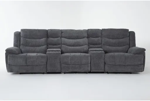Experience the ultimate in comfort and convenience with the Cruz Smoke Grey 5 Piece Power Reclining Home Theater Modular Sectional. This casual sectional is designed to enhance your living room with its smoke-colored fabric and modular design. Enjoy the added features of storage cupholders and USB ports, making it perfect for movie nights and family gatherings.