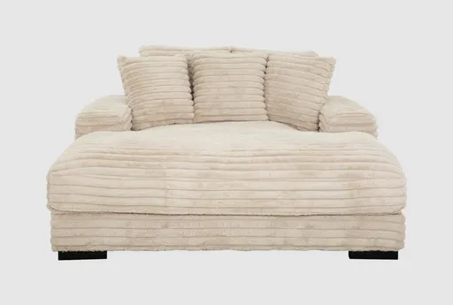 Cuddler Taupe Oversized Chair & A Half Chaise is a casual oversized chaise designed for relaxed lounging and easy everyday living. Upholstered in plush faux fur with a corduroy texture in beige, it offers a deep single-seat chaise with medium-firm support that invites long movies, naps or curling up with a friend. A plywood frame and low platform base keep the piece grounded, while a padded arm provides a comfortable spot to rest between moments of lounging.
