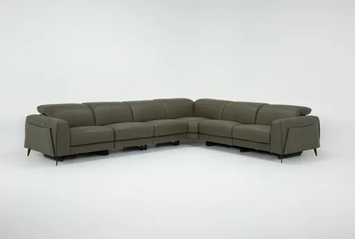 Cullen Olive Green Leather 143" 6 Piece Power Zero Gravity Reclining Modular Sectional With Armless Chair Power Headrest Storage Hidden Cupholders & USB