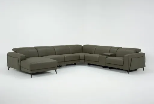 Experience the ultimate in comfort and style with the Cullen Olive Green Leather 156" 7 Piece Power Zero Gravity Reclining Modular Sectional. This contemporary sectional features a left arm facing chaise and is upholstered in 100% top grain leather. With its power headrest, hidden cupholders, wireless charging, and USB ports, this sectional is designed to meet all your modern living needs.