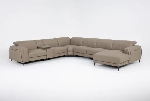 Cullen Taupe Beige Leather 156" 7 Piece Power Zero Gravity Reclining Modular Sectional With Console Right Arm Facing Chaise Power Headrest Storage Hidden Cupholders & USB