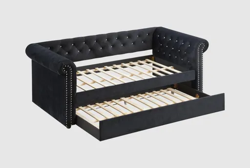 The Dahlia Black Twin Velvet Upholstered Daybed with Trundle combines classic elegance with practical functionality. Its luxurious velvet upholstery and nailhead trim add a touch of sophistication to any room, while the poplar wood frame ensures durability. The trundle feature provides an extra sleeping space, making it perfect for guests.