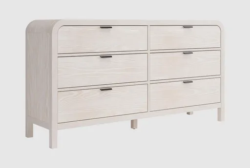 Enhance your bedroom with the Daisie Beige Wood 34" 6 Drawer Dresser. This modern piece features a sleek design blended with practical storage solutions, making it a perfect addition to any sleeping space. The dresser's meranti wood construction ensures durability and style.