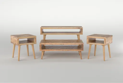 Clean lines and rustic textures meet in our unique Dakota occasional tables. Crafted with solid pine, the designs are natural beauties that boast mid-century modern roots and open shelves for arranging magazines and accents.