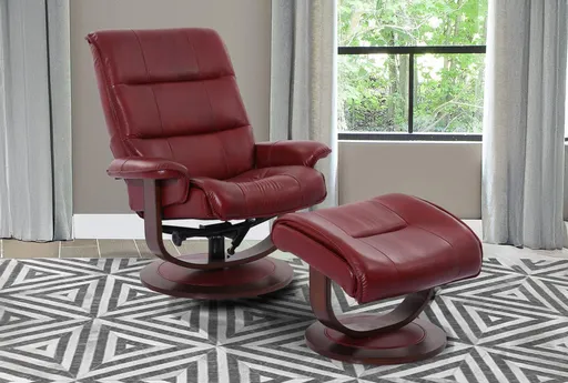Experience the ultimate relaxation with the Dalbert Red Leather Manual Reclining Swivel Arm Chair and Ottoman. This chair, designed for comfort and style, features 100% top grain leather with match upholstery in a striking rouge color. Perfect for reading or lounging in your living room, this armchair offers firm support and a high back, ensuring you stay comfortable for hours. Includes a matching ottoman for added comfort. Swivel and reclining functionality for ultimate adjustability. Channel tufted design adds a touch of sophistication.