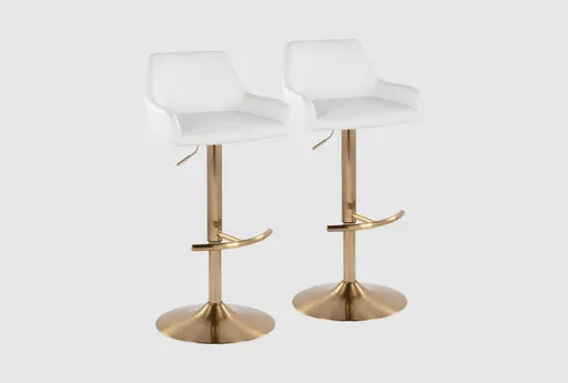 Enhance your modern living space with the Daniella Contemporary Adjustable Barstool Set. Featuring a sleek design, these barstools combine contemporary styling with practical functionality. The white faux leather upholstery and gold metal base create a sophisticated look that will elevate any room.