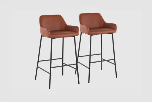 The Danny Black Metal + Camel Faux Leather 30" Barstool Set Of 2 is a modern addition to your dining or kitchen space. These stools are designed with comfort and style in mind, featuring track arms and soft camel faux leather upholstery. Ideal for food prep and serving areas, these barstools provide both functionality and aesthetic appeal.