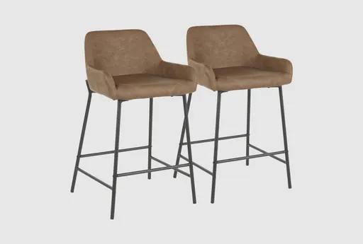 Enhance your dining or kitchen space with the Danny Espresso Faux Leather Metal 24.5" Counter Height Stool Set Of 2. This modern bistro-style stool set is perfect for adding comfort and functionality to your home. The faux leather upholstery and painted steel frame combine durability with a sleek look. Set of 2 counter height stools with arms for added support. Faux leather and foam construction for comfortable seating. Ideal for dining rooms and kitchen spaces.