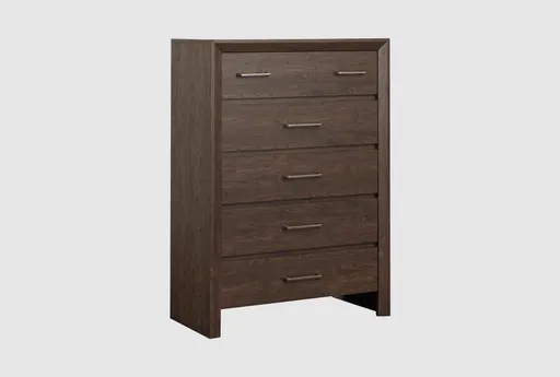 The Daxton Brown Wood 5-Drawer Chest is a perfect blend of classic and modern styles, making it a versatile addition to any bedroom. Crafted from cherry paper veneers and hardwood solids, this chest features a rich Columbian Walnut finish that adds a touch of sophistication to your space. With five spacious drawers, it offers ample storage for all your essentials. Classic design with contemporary and modern elements. Constructed from cherry paper veneers and hardwood solids. Features five drawers for generous storage capacity.