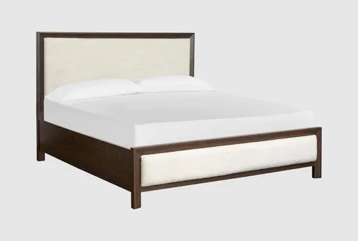 The Daxton King Wood & Upholstered Panel Bed combines classic design with modern comfort in your bedroom. The rich Columbian walnut finish creates a warm and inviting atmosphere, while the upholstered panels add a touch of sophistication. Perfectly sized for an eastern king mattress, this bed promises both style and restful sleep. Features a sturdy wood frame with cherry paper veneers and hardwood solids. Upholstered in soft fabric for added comfort. Designed for use with a box spring for optimal mattress support.