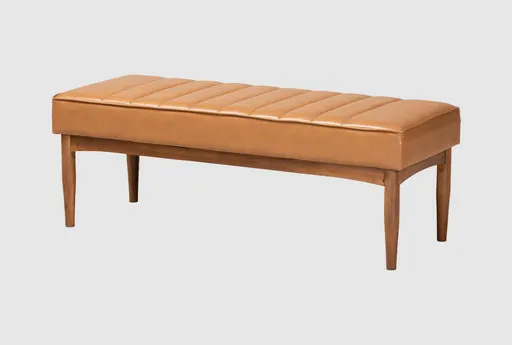 The Daymond Mid-Century Modern Tan Faux Leather Upholstered and Walnut Brown Wood Dining Bench is a stylish and functional addition to any dining space. Its mid-century modern design is complemented by the warm tones of tan faux leather and walnut brown wood, creating a sophisticated look. The bench is constructed from durable rubberwood and engineered wood, ensuring longevity and stability.