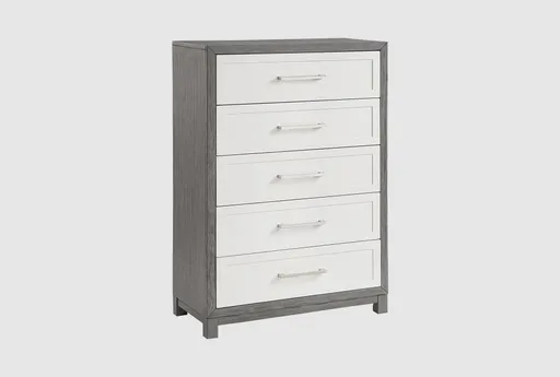 The Deacon 5-Drawer Chest is a perfect blend of casual and farmhouse styles, featuring a charming 2-tone finish in ivory and gray. Crafted from high-quality Asian hardwood, MDF, PU frame, and poplar, this chest is both durable and stylish. The five dovetail drawers with ball bearing glides ensure smooth operation and ample storage space for your belongings.