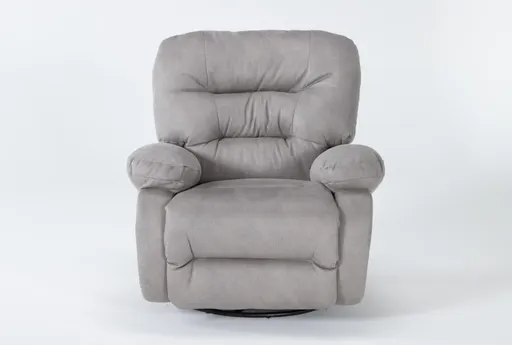 Decker III Fabric Swivel Glider Recliner pairs plush comfort with everyday practicality in a single versatile seating solution. Upholstered in soft grey fabric with tufted back details and pillow top arms, this recliner offers cushioned support for reading, nursing, or movie nights. The seat features dacron wrapped foam and foam cushions that maintain loft while a reinforced frame preserves structural integrity through regular use. A wood and metal pedestal base in a natural finish enables smooth swivel and glider motion, and the design is battery pack compatible for optional power recline upgrades.Thoughtful proportions make this piece a smart small space solution for apartments, nurseries, or home offices where modern living room furniture needs to be both comfortable and compact. Supportive lumbar shaping and cushioned arms make extended lounging easy, while the tufted silhouette reads as a transitional accent in many decors. Durable upholstery stands up to daily wear and is simple to maintain with spot cleaning or a quick vacuum. Imagine this swivel recliner as your go-to reading chair or nursery rocker that delivers relaxed function families rely on.