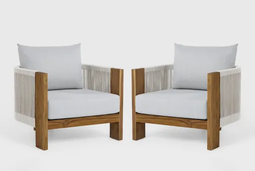 Del Mar Teak + Rope Outdoor 2 Piece Lounge Chair Set brings warm, natural comfort to your outdoor living areas with a teak frame and rope-wrapped arms. Teak and rope pair with plush, comfort-forward outdoor fabric cushions that have removable covers for easy upkeep. Cushion covers are machine washable, and the two-piece setup offers flexible seating for a deck, patio, or veranda. Durable joinery and thoughtful proportions make this set a reliable choice for relaxed outdoor gatherings.