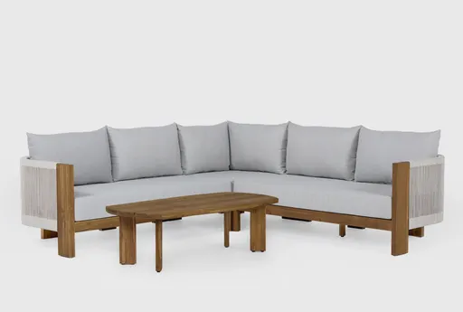 Del Mar Teak + Rope Outdoor 3 Piece Sectional With Coffee Table brings relaxed, design-forward seating to patios and terraces with a warm teak frame, woven rope accents and plush grey outdoor fabric cushions. The modular L-shape layout defines a comfortable lounge area while the coordinating teak coffee table provides a stable surface for drinks and gatherings. Cushion covers are removable and machine washable for low-maintenance outdoor living, making this three-piece set a versatile choice for decks, verandas and patios.