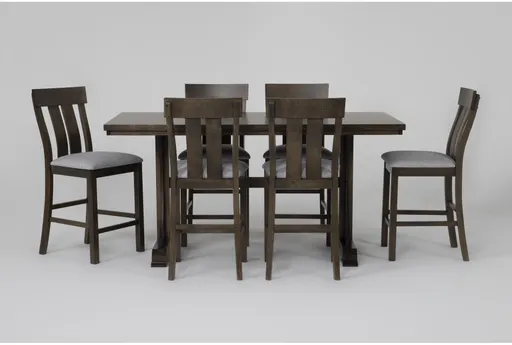 The Delfina Counter Table Set for 6 is perfect for your dining room or kitchen. This tall, armless set features a natural finish and a rectangular shape, making it a timeless addition to your home.