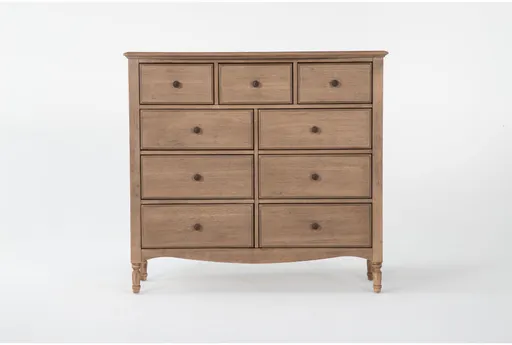 The Deliah Tall Natural Wood 46" 9 Drawer Chest brings a timeless touch to your bedroom. This traditional piece is constructed from acacia veneer and solid hardwood, ensuring durability and a beautiful finish. Perfect for small spaces, this chest offers ample storage with its nine drawers.