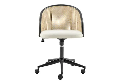 The Demis Adjustable Rolling Office Desk Chair in beige with a black base and natural beige cane offers a blend of comfort and style for your workspace. Its ergonomic design ensures support during long hours at your desk, while the armless feature provides ease of movement. The chair's swivel function and rolling casters make it highly versatile and adaptable to your office needs.