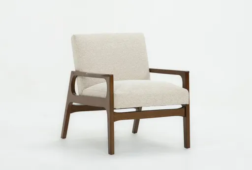 Derick II Sand Accent Chair brings a calm, modern presence to the living room with sand fabric upholstery and an open Asian hardwood frame. The seat is upholstered in sand fabric (100% polyester) that feels soft to the touch while the visible wood arms and rails keep the silhouette airy and structured. Use it as a reading chair or a companion piece to a sofa to add a comfortable, composed spot for everyday living.