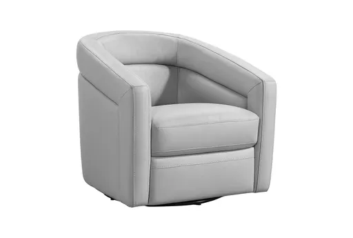 Desi Contemporary Swivel Accent Chair in Dove Grey Genuine Leather combines a compact barrel shape with a smooth swivel base so you can pivot easily during conversations or to reach a nearby table. Upholstered in genuine leather over plush foam, it sits on a plywood frame that balances support with everyday comfort. A recessed armrest keeps the profile tidy while still offering steady arm support, making this chair a versatile pick for living rooms and family rooms.