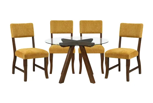Deville Dining Table Set For 4 With Yellow Side Chairs updates your dining room with a contemporary look centered on a tempered glass tabletop that is easy to clean and brightens the space. The round glass top rests on a bent-wood base while four yellow side chairs are upholstered in 100% polyester for comfortable everyday seating. Components include MDF, plywood and rubberwood elements for stable support, giving this compact five-piece set a balanced mix of durability and visual lightness.