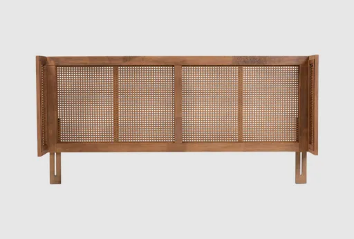 Enhance your bedroom with the Devynn King Ash Walnut Finish Brown Natural Wood and Synthetic Rattan Wrap Around Headboard. This mid-century modern piece combines ash walnut wood and natural rattan, creating a stylish and functional addition to your sleeping space. The woven design adds a touch of retro charm, perfect for a bedroom suite that embraces a soft, neutral palette.