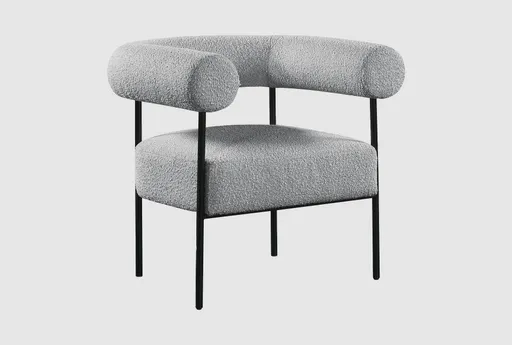 The Dex Boucle Fabric Accent Chair brings modern elegance to any living space. Its rich boucle upholstered texture creates a salt and pepper effect against the sleek matte black metal frame. This stylish accent chair is perfect for contemporary interiors.