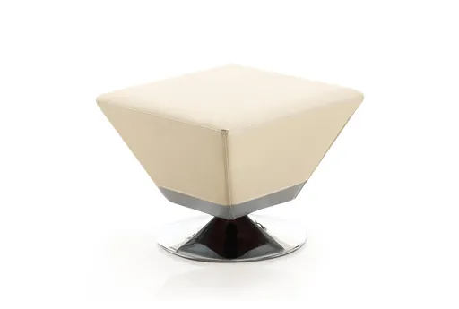 The Diamond Swivel Ottoman in tan with a polished chrome metal base brings a sculptural triangular silhouette to the living room while serving as a comfortable footrest or extra seat. Upholstered in leather match with leather accents, the padded top offers supportive comfort and easy-care performance. The smooth swivel mechanism rotates quietly, making it simple to reposition the ottoman for conversation or lounging.