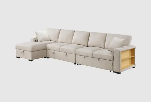 * **Left-Facing Chaise Storage** Generous internal compartment with pine shelf accents offers hidden storage without sacrificing seating depth.