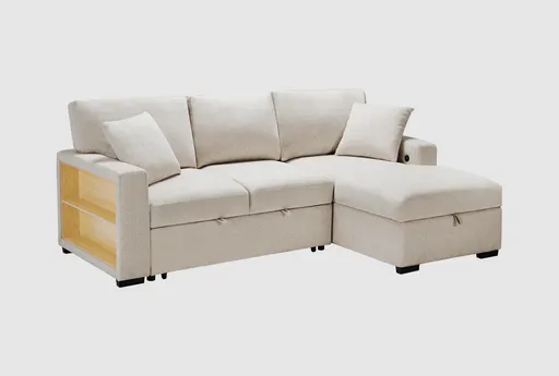 The Dimitri Beige Sectional with Right Chaise Pull-Out Bed and Hidden Storage is the perfect addition to any casual living space. Its versatile design and neutral beige color make it easy to blend with various decor styles. Crafted from durable fabric and featuring a solid wood and plywood frame, this sectional is built to last.